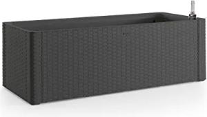 XL Pflanzkasten rechteckig im Rattan-Design aus Kunststoff in Anthrazit. Mit Wasserspeicher und Wasserstandsanzeige, Maße BxTxH 100 x 43 x 33 cm.