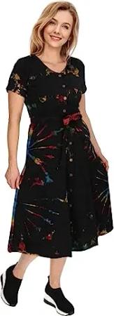 Kleid Batik Sommerkleid Baumwoll Kleid Boho Ibiza Geköpft Hippie Tie Dye, Größe:S, Farbe:Black/Schwarz