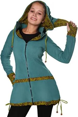 Fleece Jacke mit tollem Kragen Goa Psy Hippie Boho, Farbe:Grün, Größe:42(XL)