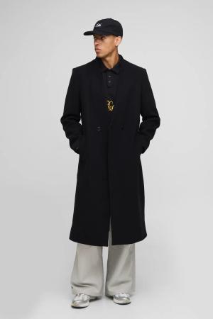 Oversized Longline Double Breasted Collarless Melton Overcoat - Black - L, Black