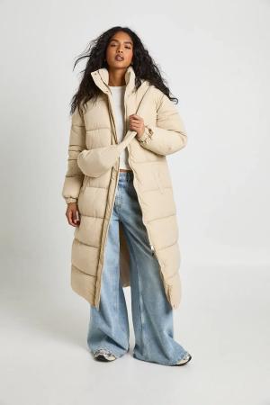 Womens Hooded Maxi Puffer With Bag - Stone - 34, Stone