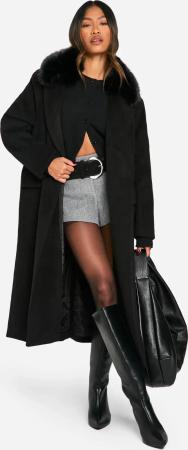 Zweireihiger Oversize Mantel In Wolloptik Mit Kunstfell-Detail - Black - 40, Black