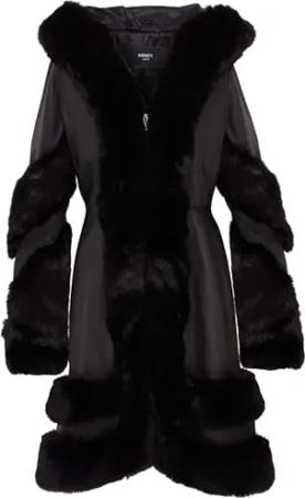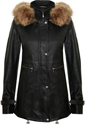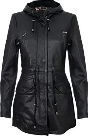 Damen Schwarz Warme Lederjacke Abnehmbare Kapuze Parka Regenmantel S