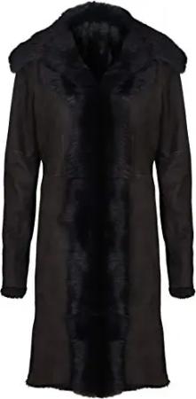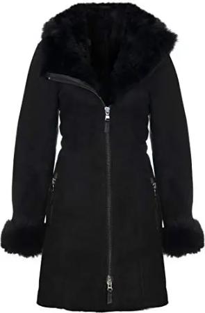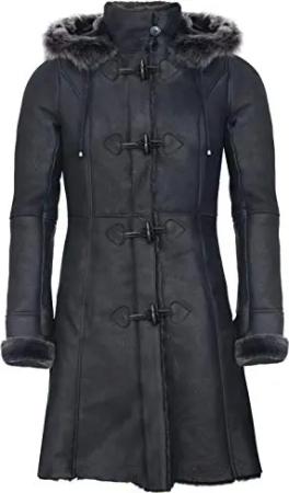 Damen Merino Schwarz Shearling Schaffell Kapuze Dufflecoat M