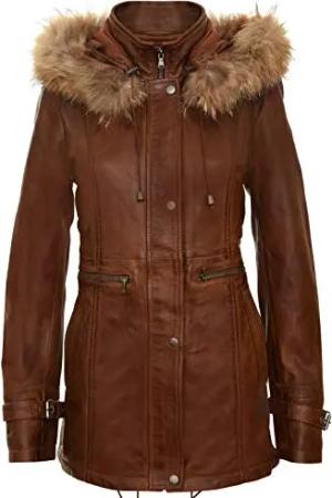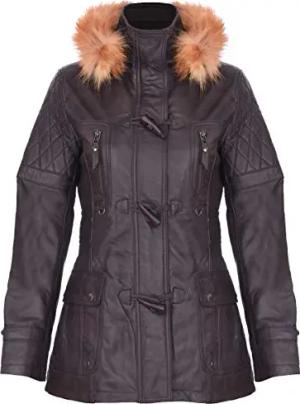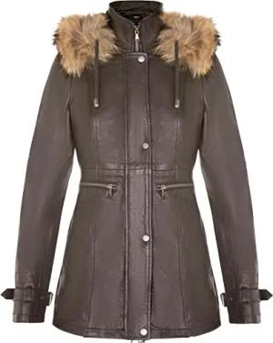 Damen Braun Warme Lederjacke Abnehmbare Kapuze Parka Regenmantel S