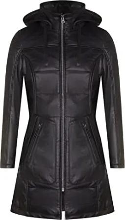 Frauen Schwarze Gesteppte Leder Parka Jacke Mit Abnehmbarer Kapuze 4XL
