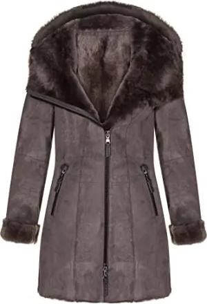 Brauner Lammfell Schaffell Merino Veloursledermantel mit Kapuze für Damen