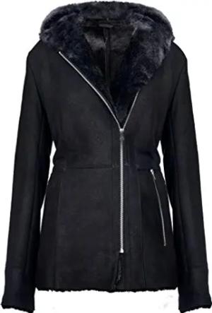 Damenjacke Aus Schwarzem Wildleder Mit Kapuze Und Lammfell Aus Lammfell Von Toscana 4XL