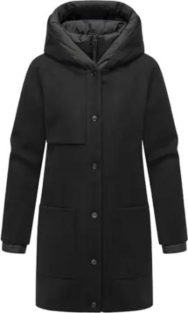 Damen Mantel lange Übergangsjacke Kurzmantel in Wolloptik mit Kapuze und (abnehmbarem) Stepp-Einsatz Flauschwunder 14 Black Gr. L