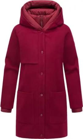 Damen Mantel lange Übergangsjacke Kurzmantel in Wolloptik mit Kapuze und (abnehmbarem) Stepp-Einsatz Flauschwunder 14 Bordeaux Gr. L
