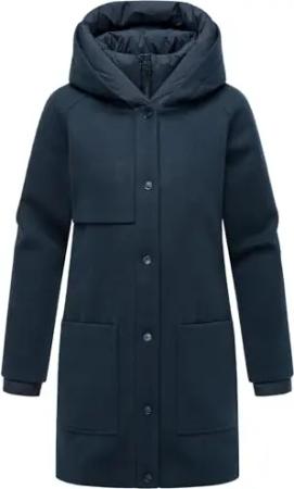 Damen Mantel lange Übergangsjacke Kurzmantel in Wolloptik mit Kapuze und (abnehmbarem) Stepp-Einsatz Flauschwunder 14 Navy Gr. XL