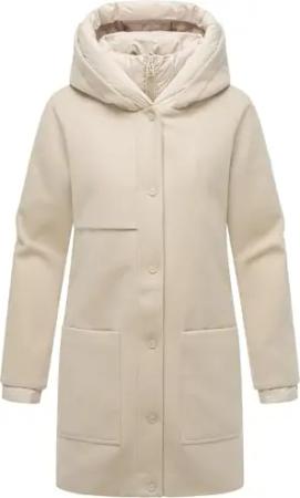 Damen Mantel lange Übergangsjacke Kurzmantel in Wolloptik mit Kapuze und (abnehmbarem) Stepp-Einsatz Flauschwunder 14 Beige Gr. L
