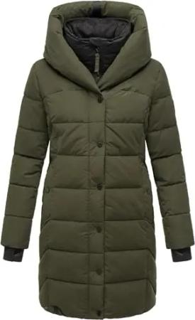Damen Wintermantel warmer Steppmantel lang mit Kapuze und abnehmbarem Fleece-Kragen Knutschilein Dark Olive Gr. XXL