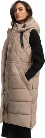 Damen Winterweste (XS-3XL) - Steppweste, lang, teils mit Magnetverschluss, verstellbare Kapuze, Warme Weste Frauen - N018 (S, Taupe-Grey)