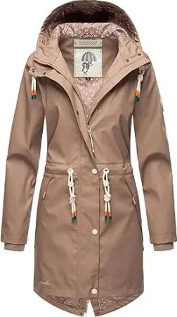 Damen Übergangsjacke Regenmantel wasserdichte lange Regenjacke mit verstellbarer Kapuze und geschweißten Nähten Tropical Stormoo Taupe Gr. M
