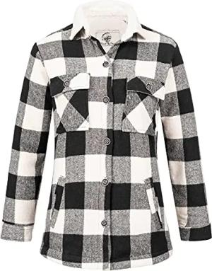 Damen Winterjacke Karierte Flanelljacke Gefüttert Holzfällerjacke Holzfällerhemd Kragen Teddyfutter Kariert Thermojacke D-469 Schwarz S