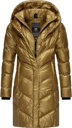 Damen wasserdichter shiny Mantel lange warme Winterjacke mit großer Kapuze Natalka Bling YOUMODO Inca Gold Gr. L