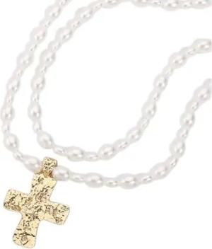 Perlenketten-Set Kreuz Weiß Gold modern Damen Halskette Kette Perlenschmuck, 2-tlg., Kreuzkette Geschenk für Frauen Damenschmuck