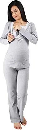 Still-Pyjama Set mit Spitze für Damen - Umstandspyjama Schlafanzug Nachtwäsche für Schwangerschaft und Stillzeit mit Stillfunktion, Langarm (Grau, X-Large)