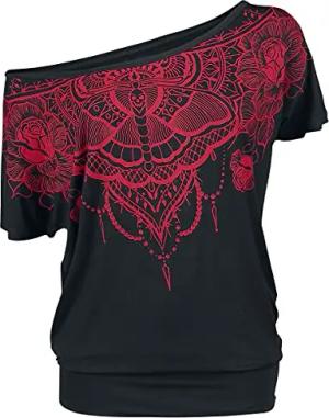 Damen rot-schwarzes T-Shirt mit Fledermausärmeln inklusive Top S