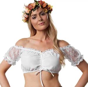 900598 Dirndlbluse, Spitzenärmel mit Blumenmuster, Rücken aus Spitze, kurz, weiß - Diverse Größen - (L | Nr. 303092)