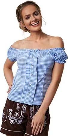 900618 Trachtenbluse mit Carmen Ausschnitt und Knopfleiste, Kurzarm, weiß blau kariert - Diverse Größen - (S | Nr. 303105)