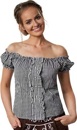 900621 Trachtenbluse mit Carmen Ausschnitt und Knopfleiste, Kurzarm, schwarz weiß kariert - Diverse Größen - (M | Nr. 303121)