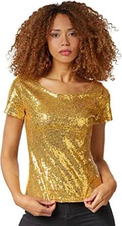 901013 Damen Pailletten Top, Glitzer Kurzarm Oberteil, Gold - Diverse Größen - (XXL)