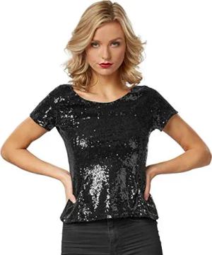 901013 Damen Pailletten Top, Glitzer Kurzarm Oberteil, schwarz - Diverse Größen - (M)