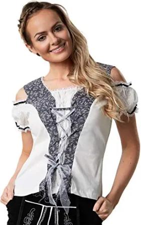 Dirndl Bluse Damen, Dirndlbluse weiß mit Blumenmuster Einsätzen, Trachtenbluse Damen, Trachtenmieder Schnürung, Bluse Spitze, Trachtenshirt, Trachtenhemd - (XL | Nr. 303173)