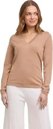 Damen Pullover Basic New Merino V-Neck W Pu Wolle elegant klassisch für Business und Freizeit mit V-Ausschnitt 1 Stück, Braun Camel 5038, XS