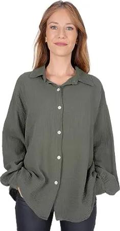 Kurze Musselinbluse Oversized Musselin Hemdbluse mit Knopfverschluss aus 100% Baumwolle (Sasha - Dark Khaki)