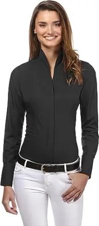 Damen Bluse mit Kelchkragen leicht tailliert 100% Baumwolle bügelleicht Langarm Hemdbluse mit Stehkragen elegant festlich auch für Business schwarz 38