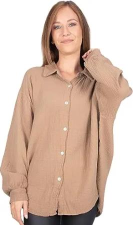 Kurze Musselinbluse Oversized Musselin Hemdbluse mit Knopfverschluss aus 100% Baumwolle (Sasha - Hellbraun)