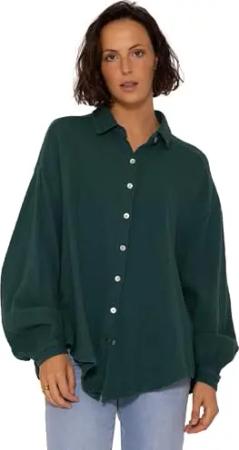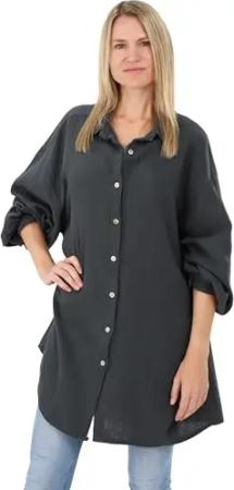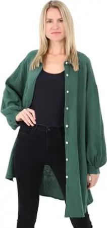 Oversize Musselin Bluse Damen Langarm - Oversized Freizeit Look - Hemdbluse lang aus Baumwolle mit V Ausschnitt - Long-Bluse One Size (Gr. 36-48) Dunkelgrün