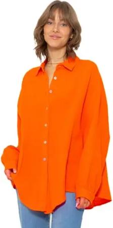 Oversize Musselin Bluse Damen Langarm - Oversized Freizeit Look - Hemdbluse lang aus Baumwolle mit V Ausschnitt - Long-Bluse One Size (Gr. 36-48) Orange