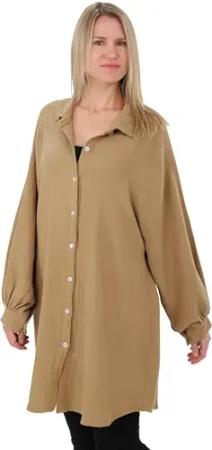 Malito Damen Musselin Bluse - Langarm Blusenhemd - langes Oversize Hemd aus Baumwolle - Long Shirt Strand Cover Up 20914 (Fango 34-46)