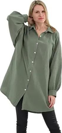 Malito Damen Musselin Bluse - Langarm Blusenhemd - langes Oversize Hemd aus Baumwolle - Long Shirt Strand Cover Up 20914 (Oliv 34-46)