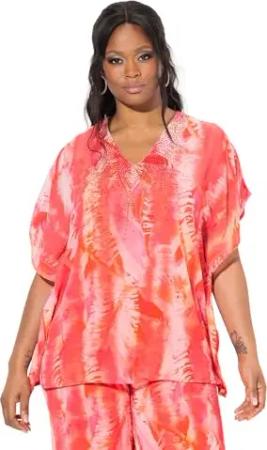 Damen große Größen Übergrößen Plus Size Chiffonbluse, Feder, doppellagig, V-Ausschnitt, Halbarm Koralle 50+ 836087506-50+