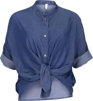 Malito - Damen Oversized-Bluse - Denimbluse mit Knotendetail - hautfreundliche Bluse in Jeans-Optik - Kurzarm Jeansbluse 2309 - Dunkelblau