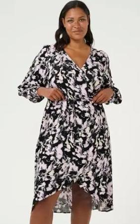 Damen Plus Size Women's Wrap Dress Long Sleeves Knee Length Printed Kleid, Schwarz/Pink Graphic Strokes, 50 Größen