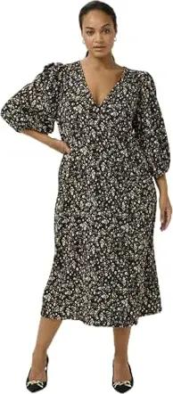 Damen Plus Size Women's Blouse V-Notch Neck Printed 3/4 Sleeve Regular Fit Bluse, Schwarz/Blauer Blumendruck, 46/Grande Taille