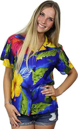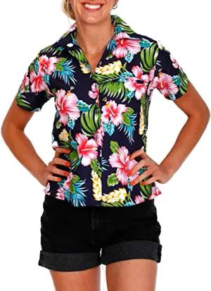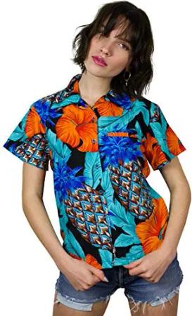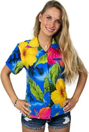 Funky Hawaii-Bluse-Hemd, Damen, Kurzarm, Pineapple-Hibiscus, Blau, XS