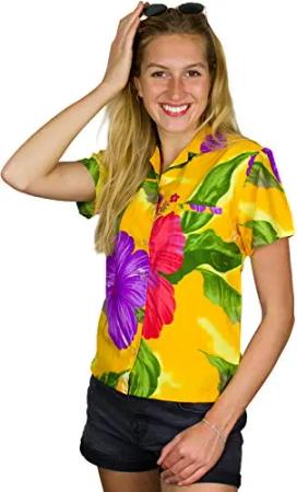 Funky Hawaii-Bluse-Hemd, Damen, Kurzarm, Big-Flower, Gelb, XXL