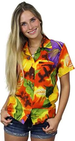Funky Hawaii-Bluse-Hemd, Damen, Kurzarm, Leopard-Flowers, Orange, L