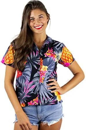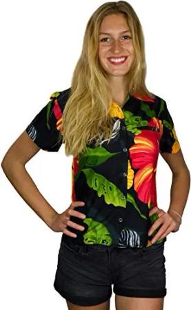 Funky Hawaii-Bluse-Hemd, Damen, Kurzarm, Pineapple-Hibiscus, Schwarz-Grün, XS