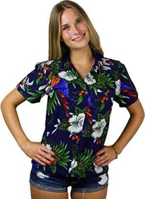 Funky Hawaii-Bluse-Hemd, Damen, Kurzarm, Cherry-Parrot, Dunkel-Blau, XS