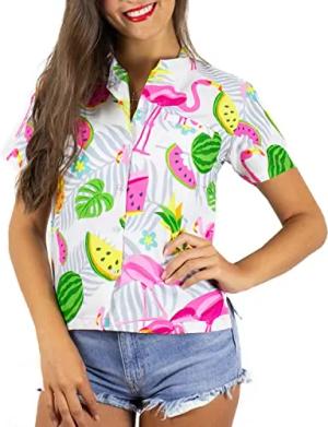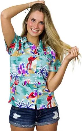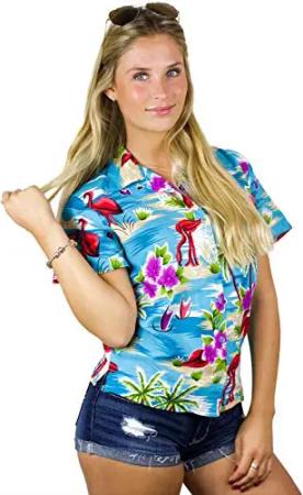Funky Hawaii-Bluse-Hemd, Damen, Kurzarm, JK-Flamingo-Melon-Print, Blau, L