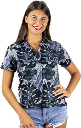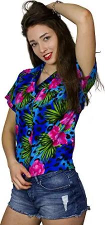 Funky Hawaii-Bluse-Hemd, Damen, Kurzarm, Leopard-Flowers, Blau, L