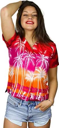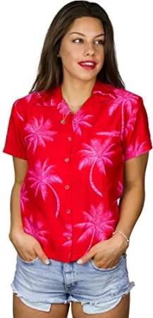 Funky-Hawaii-Bluse-Hemd, Damen, Kurzarm, Palm-Shadow, Rot-Pink, XS